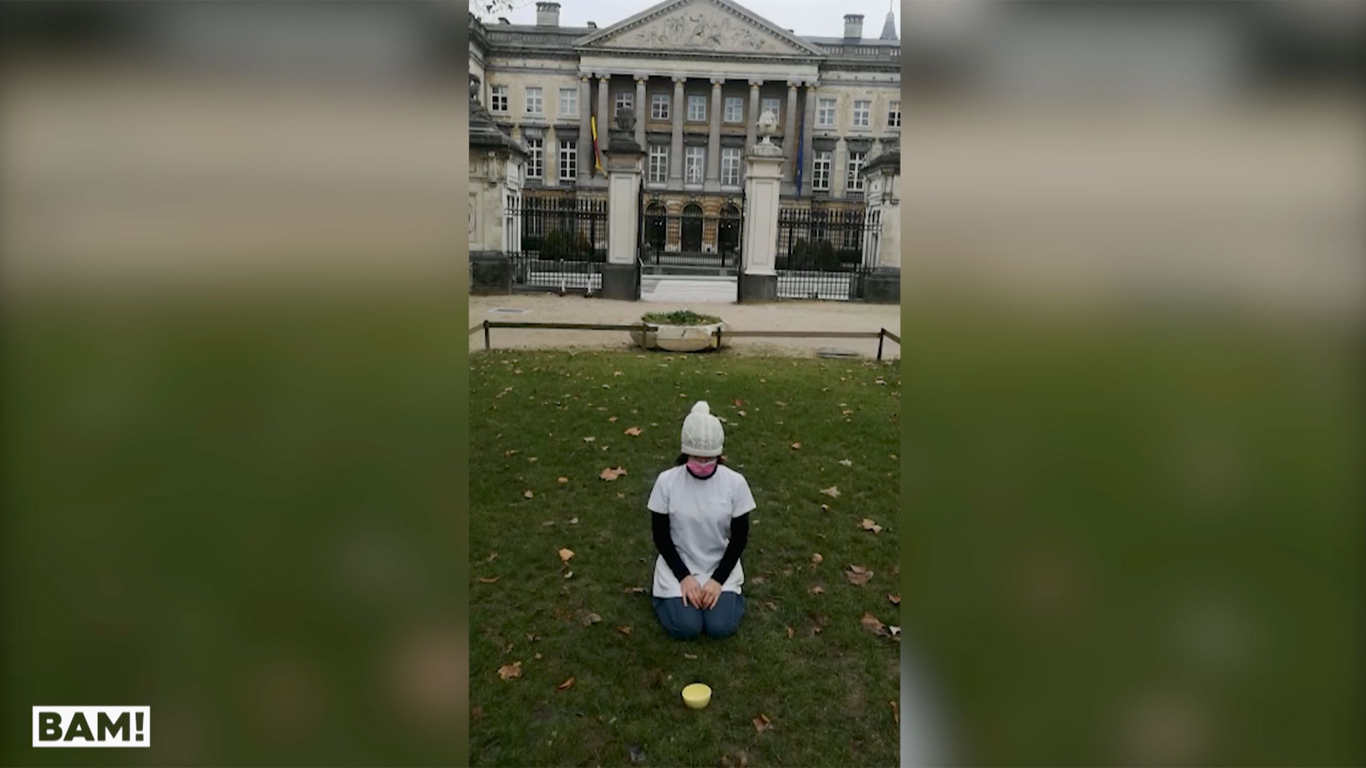Cette infirmière manifeste sous l’allure d’une mendiante faisant la manche devant le 16 rue de la Loi. L’idée : recueillir des sous pour les infirmiers et médecins non-vaccinés qui de ce fait risquent de perdre leur travail.